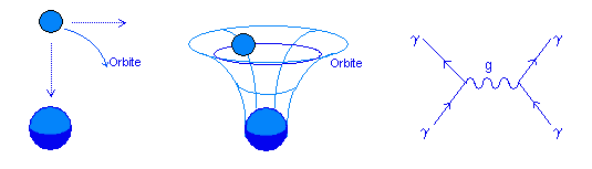 Einstein imagina une théorie, sans s’appuyer sur la moindre expérience ou observation, donnant à l’espace des propriétés particulières : l’espace est courbe et quand la Terre suit sa trajectoire, droit devant, elle suit la courbure de l’espace environnant. La présence de masses dans l’ Univers courbe l’espace. La gravitation n’est pas une propriété des masses mais de l’espace.