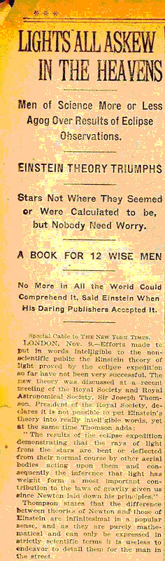 Le Times de Londres titra le 7 novembre, page 12, « Révolution scientifique : les idées de Newton détrônées « , puis « l’espace est tordu « . Le 9 novembre le New York Times titra : « Triomphe de la théorie d’ Einstein : les étoiles ne sont pas là on l’on croit, mais inutile de s’inquiéter … ».