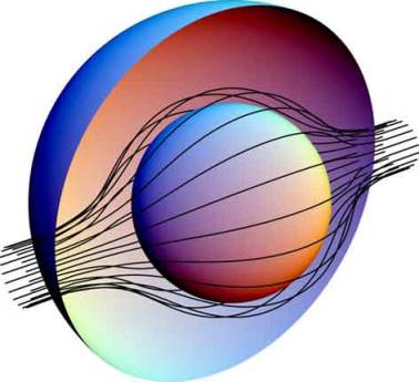 dessin, la lumière (les lignes en noir) contournent l'objet (la sphère orange)