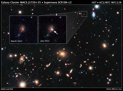 Photo : Image couleur de l’amas MACSJ1720+35 prise par Hubble et montrant en agrandissement l’apparition de la supernova (marquée par une flèche) entre deux époques d’observation. © NASA/ESA