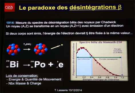 Or, la radioactivité béta posait un problème, un électron était éjecté du noyau avec une énergie variable ce qui semblait prouver qu'une certaine quantité d'énergie était émise (conservation de l'énergie, une grande loi de la physique) mais non détectée.