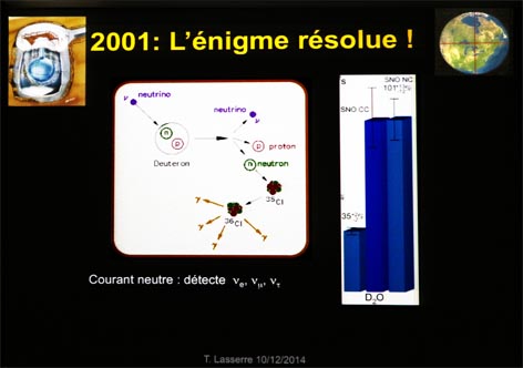 C’est, contrairement aux autres, un détecteur à eau lourde (1000 tonnes 300M$), et c’est cette caractéristique qui permet de mettre en évidence les trois types de neutrinos (n’importe quel type de neutrino peut interagir avec D) et là, …..le compte est bon !