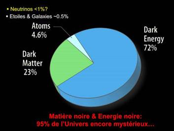 Nous (les hommes, les étoiles, les galaxies) ne représentons que 0,5% parmi les 4,6% d’atomes, la matière noire 23% et l’énergie noire 72% du total.
