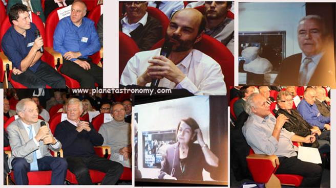 De gauche à droite et de haut en bas : JF Forget planétologue à l’IPSL ; JB Renard CNRS Orléans ; R Lehoucq astrophysicien CEA ; M. Fulchignoni du LESIA (en vidéo de Darmstadt) ; A. Brahic du CEA ; JL Chrétien astronaute ; JF Clervoy astronaute ; AC Levasseur Regourd du LATMOS (en vidéo de Darmstadt) ; JP Luminet astrophysicien du Luth ; JP Lebreton du LPC2E.