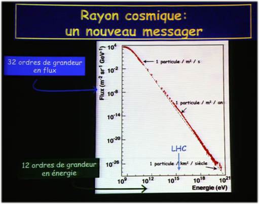 Les cosmiques les moins énergétiques sont les plus nombreux alors que les particules les plus énergétiques le sont par exemple quelques millions de fois plus que celles accélérées dans le LHC.