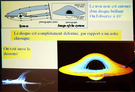 Un trou noir est entouré d’un disque brillant (car en avalant la matière celle-ci chauffe), mais ce disque est complètement déformé à cause de l’énorme gravité, on arrive même à en voir …le dessous.