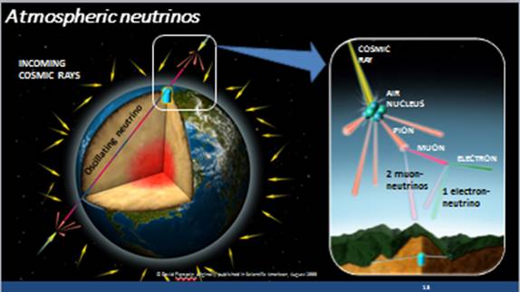 On s'aperçoit que le nombre de neutrinos détectés provenant du "haut" est le nombre attendu (les neutrinos muoniques descendants n'ont pas le temps de se transformer dans une autre saveur avant d'atteindre le détecteur,), alors que le nombre de neutrinos provenant du "bas" (ayant traversés la Terre et parcourent jusqu'à mille fois plus de chemin, se convertissent vraisemblablement en neutrinos tauiques) est en déficit d'un facteur