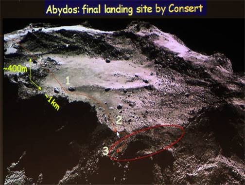 On voit ci-contre la trajectoire reconstituée grâce à l’instrument CONSERT.
