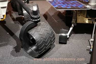 On peut comparer la taille des roues de Curiosity (à gauche avec celle des rovers Spirit ou Opportunity).