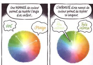 On peut représenter un nombre complexe par une couleur. Dans l'ensemble des nuances de couleurs, rouge, orangé, jaune, vert, bleu, violet, pourpre puis après le rouge vous pouvez recommencer, donc former le cercle des couleurs d’une façon continue ; alors vous pouvez repérer un angle par une couleur.