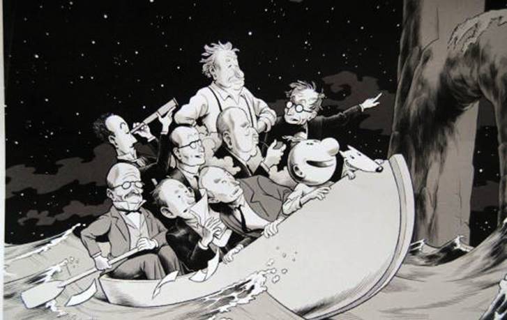 Schrödinger trouvait que c’était une sorte d’absurdité. Il y a quelque chose d’absurde dans le formalisme de la physique quantique. On sait aussi qu’Albert Einstein a donné aussi un autre exemple qui joue un très grand rôle dans notre histoire. Le 14 avril 1954 Einstein a donné à Princeton le dernier séminaire de sa carrière. Dans la BD vous aurez des renseignements de première main sur ce séminaire puisque je connais des gens, qui sont