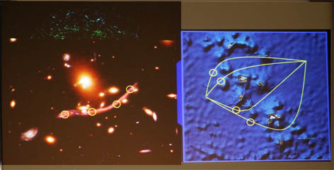 On voit parfaitement l’arc provoqué par la déviation des rayons par les « bosses » de matière noire.