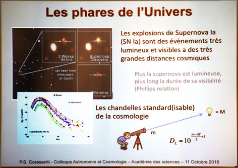 Les supernovas, phénomènes très lumineux et pour ainsi dire constants en intensité absolues, nous servent de phares dans l’Univers (des chandelles standards) permettant ainsi une évaluation des distances à grandes échelles.