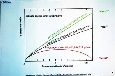 Pour comprendre la platitude, posons la densité de l’Univers 1ns après le BB. Et on ne change QUE la dernière décimale d’un nombre énorme comme sur le graphique.
