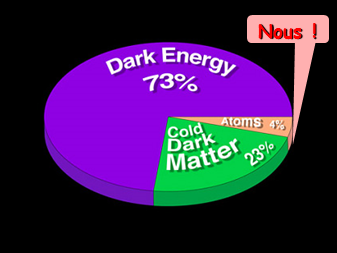 Néanmoins de nombreuses questions restent en suspens : nous, les hommes, les animaux, les étoiles ne représenterions que 5% de l’Univers, le reste serait une matière inconnue, la matière noire, et une énergie tout autant inconnue, l’énergie noire.
