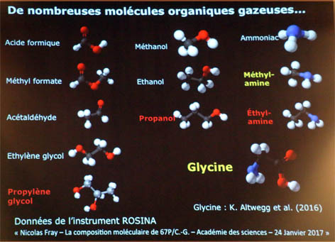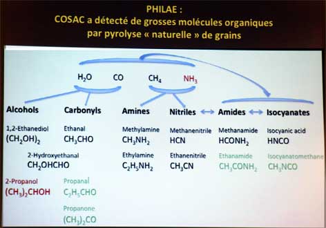 Si le Méthanol, l’Éthanol et l’Ammoniac étaient déjà connus, Rosetta a détecté de nouvelles molécules organiques comme celles représentées en orange sur le tableau ci-contre.