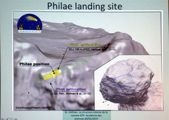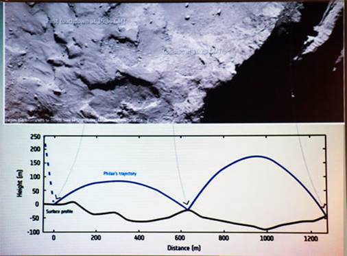 L’atterrissage s’est mal passé, les 3 systèmes n’ont pas fonctionné, Philae a rebondi, on a pu tracer sa trajectoire.