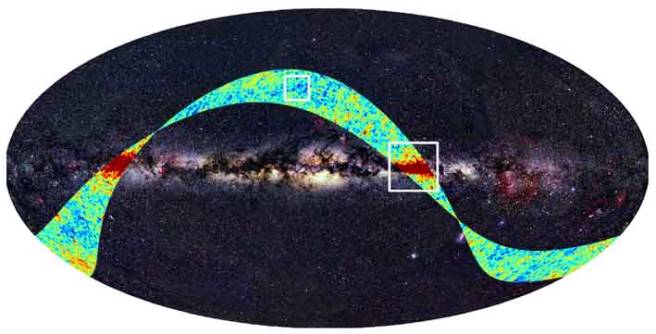 carte superpose la bande de ciel observée par Planck (en fausses couleurs,