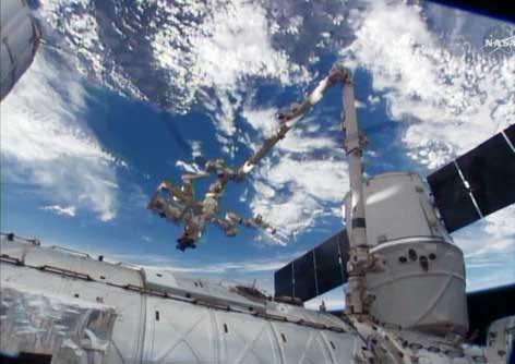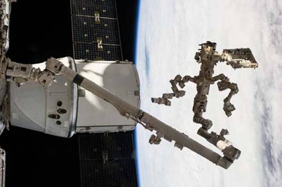 Le bras télémanipulateur Canadarm2 supporte Dextre ; à droite de l’image la capsule Dragon. (Photo NASA)