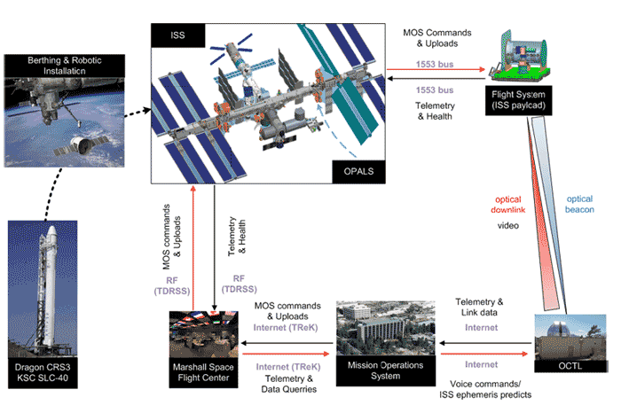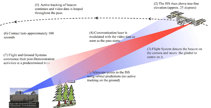 Un signal lumineux (Laser) est émis par la station terrestre à Table Mountain, OPALS le reçoit sur l’ISS et se verrouille sur ce signal puis commence à envoyer les données par son propre Laser. Le signal lumineux était parfaitement visible (voir la vidéo plus loin avec tous les détails).
