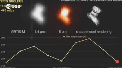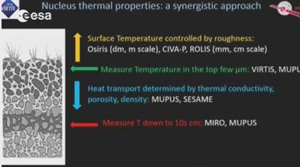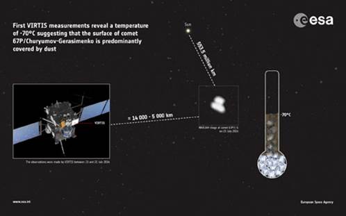 Par ailleurs, les mesures effectuées par l'instrument VIRTIS (spectromètre de cartographie thermique dans le visible et l'infrarouge) révélaient une température moyenne de l'ordre de -70° C, ce qui correspond à une surface globalement sombre et poussiéreuse plutôt que propre et glacée.