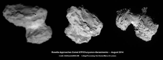 « Cette structure bilobée résulte-t-elle de la rencontre de deux comètes distinctes à un moment de l'histoire du système solaire ou s'agit-il d'une comète qui a connu une érosion spectaculaire et asymétrique au fil du temps ? Avec ses instruments, Rosetta est parfaitement positionnée pour étudier au mieux un corps céleste aussi exceptionnel. »