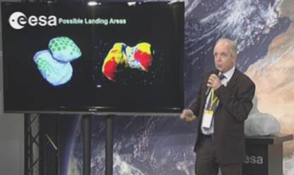 Le Dr Stefan Ulamec, le responsable de Philae à la DLR, nous montre une ébauche de ce que pourraient être les terrains d’atterrissage possibles. |