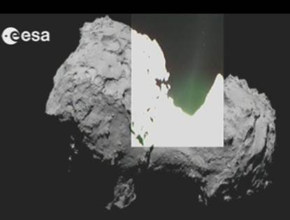 Image très intéressante qui à ma connaissance n’est pas encore publiée par l’ESA. On voit au centre du noyau avec un réglage différent, l’évaporation d’une partie du sol de la comète, ce qui va produire la coma. |