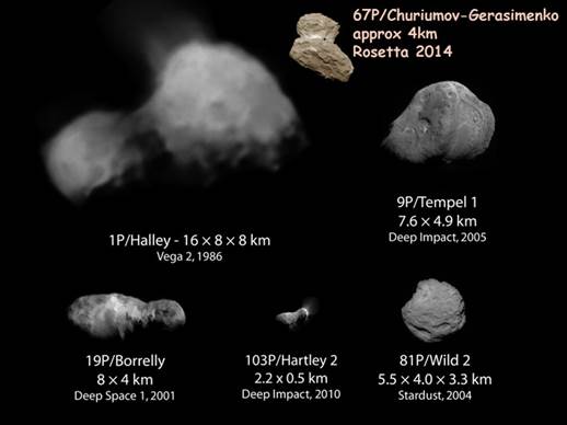 On se rend bien compte de la forme très différente de 67P par rapport aux noyaux visités.