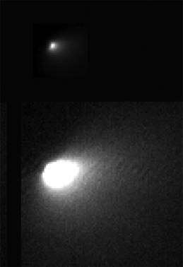 Vue par la caméra HiRise de MRO ; on voit le noyau et la coma ; en haut dans sa globalité, en bas, agrandis et contraste poussé.