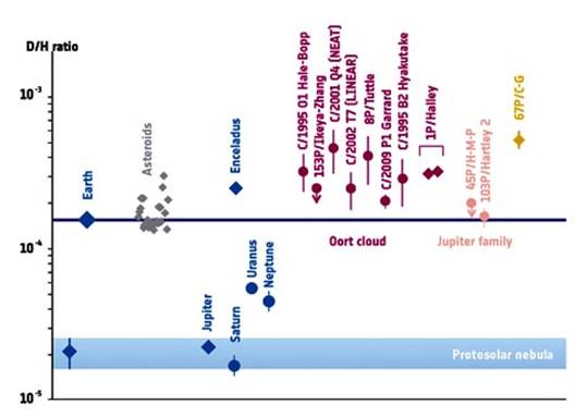 C’est dans ce contexte que les observations effectuées par Rosetta sont importantes. Fait intéressant, le rapport D/H mesuré par ROSINA (spectromètre pour l’analyse des ions et des particules neutres) est plus de trois fois plus grand que celui des océans sur Terre et de la comète jovienne Hartley 2. En effet, il est même supérieur à celui mesuré pour les comètes issues du nuage d’Oort.