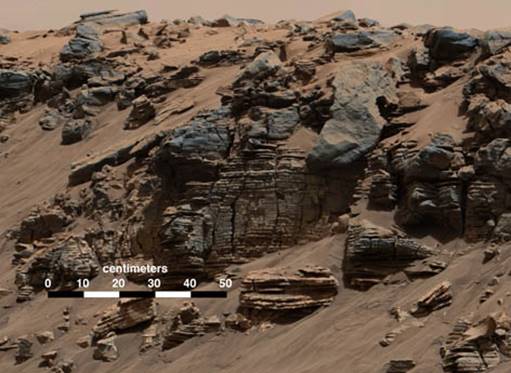 On remarque sur cette image des dépôts inclinés que l’on peut interpréter comme les dépôts de petits deltas alimentés par des rivières provenant des bords du cratère afin de former un lac là où se trouve le Mont Sharp maintenant.