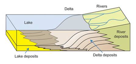 Ce diagramme montre l’embouchure de la rivière dans le lac, là où l’eau pénètre dans le lac, son débit diminue et des sédiments se déposent, au cours du temps la formation de ces sédiments s’incline.