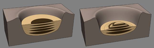 Après que le cratère soit rempli jusqu’à une hauteur de quelques centaines de mètres et que les sédiments se soit durcis en roches, ces différentes couches ont été au cours du temps sculptées en forme de montagne par l’érosion due aux vents