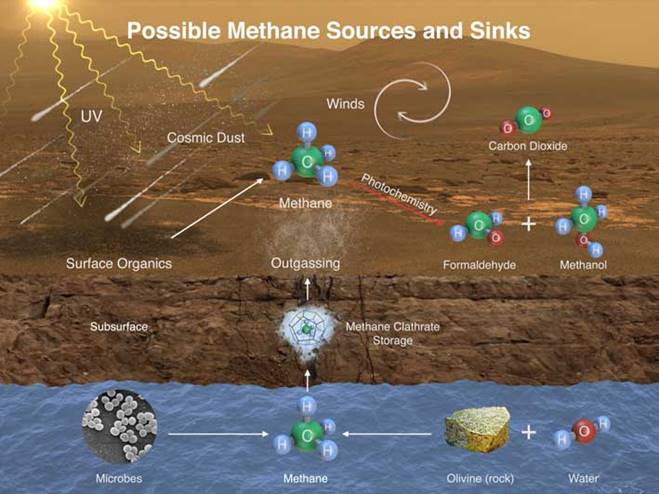 Le méthane ou CH4 c’est un atome de Carbone et 4 atomes d’Hydrogène ; le CH4 peut provenir de microbes et peut aussi provenir par des processus qui ne requiert pas la vie ; comme par exemple des réactions chimiques entre l’eau et des roches (olivine, pyroxène..). Les UV aussi, peuvent produire des réactions qui génèrent du méthane à partir de matières organiques.