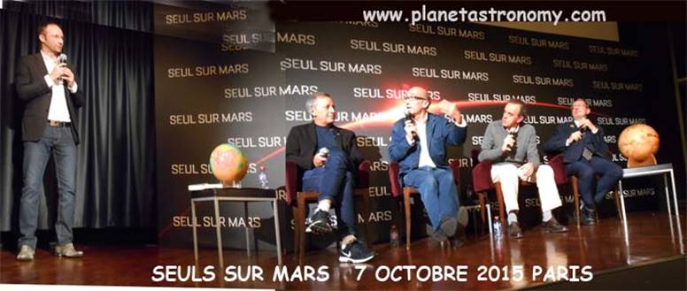 Les invités du débat (de gauche à droite après Gilles) : Michel Tognini astronaute , Alain Souchier Président de l’association Planète Mars, Francis Rocard Directeur de l’exploration du système solaire au CNES et Olivier de Goursac de la Planetary Society et de APM, grand spécialiste de Mars.
