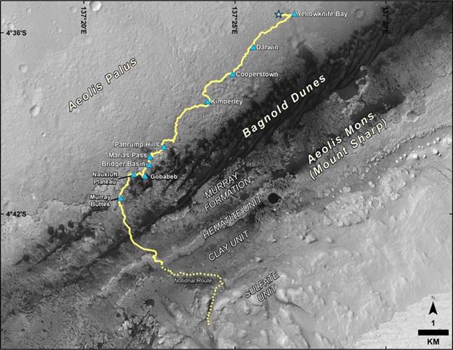 On représente ainsi la position du rover fin 2016 à différentes étapes de sa progression vers le Mont Sharp.