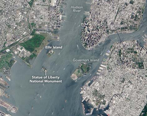 La première vue qu’avaient les premiers immigrés européens accostant à New York, c’était cette presqu’île de Manhattan avec à son entrée, la fameuse statue de la Liberté (érigée en 1886) et Ellis Island, lieu où ils devaient se faire enregistrer.