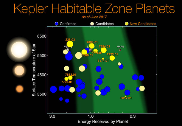 Illustration : les exoplanètes de type terrestre situées dans la zone habitable (en vert) à la date de Juin 2017.