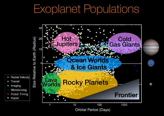 Le triangle gris dans le coin inférieur droit représente les explorations futures avec de nouvelles missions (genre TESS ou JWST).