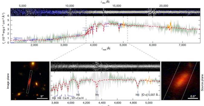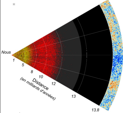 plus son redshift est grand et plus la lumière qui nous en parvient a été émise tôt dans l’histoire de l’Univers. On mesure ainsi la distance en terme d’âge de l’Univers (ou de redshift), entre aujourd’hui et la naissance de l’Univers (Big Bang) il y a 13,8 milliards d’années environ.