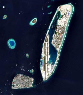Vue plus en détail de l’aéroport et de l’ile principale de Malé, la