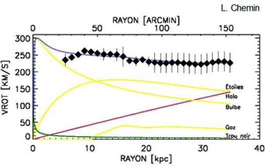 La contribution des étoiles du bulbe central : la courbe en jaune marquée bulbe, c'est une forme comme celle-ci que l'on attendait d'après les équations kepleriennes.