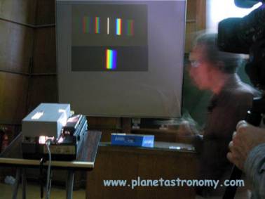 Joignant le geste à la parole, P Boissé nous montre quelques spectres sur écran; en bas spectre après prisme, en haut franges d'interférences.