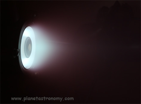 C’est ce principe qui est mis en œuvre ici au Palais de la Découverte avec ce mini propulseur à effet Hall (ou propulseur ionique ou à plasma froid) de 100W au Krypton mis au point par le labo CNRS-ICARE d’Orléans.
