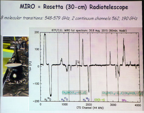 MIRO (Microwave Instrument for Rosetta Orbiter, instrument construit par le JPL du CalTech avec contributions du LESIA et du LERMA de l’Obs de Paris-Meudon et du Max Planck Intitut für Sonnensystemeforschung) est un petit télescope capable d’observer certaines raies dans le domaine micro-ondes.
