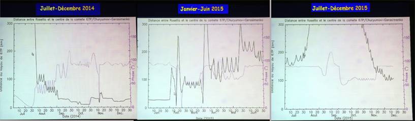 La courbe en noir foncé représente la distance au noyau en km, on remarque que l’on s’est approché au plus près pendant la période d largage de Philae en oct nov 2014, et que l’on s’est éloigné très fortement à l’approche du périhélie (août 2015).