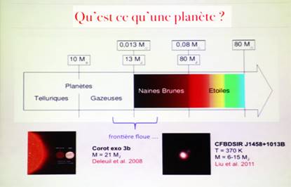 Après une définition de ce qu’est une planète, le conférencier nous détaille les limites en masse entre planète et étoile.