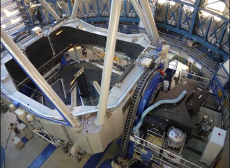Photo : l’instrument SPHERE placé à côté du télescope du VLT (ESO)