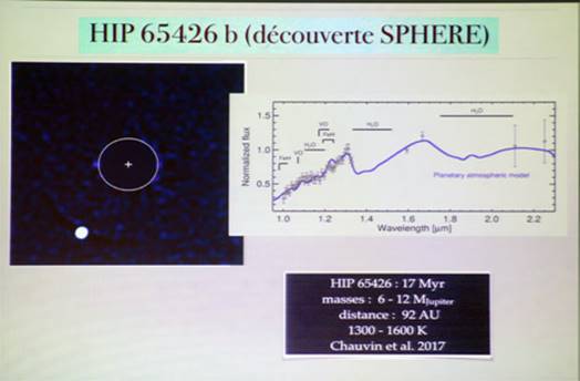 déjà vue ; mais récemment (été 2017) cet instrument a découvert l’exoplanète HIP 65426 b. elle est située à 385 al de nous et serait âgée d’une quinzaine de millions d’années. Géante gazeuse d’une dizaine de fois la masse de Jupiter, elle posséderait de l’eau dans son atmosphère, bien que sa température de surface soit élevée (plus de 1000°C).